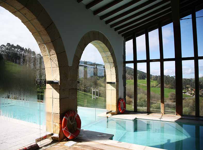 Aunque la panorámica de los valles se divisa desde cualquier rincón del jardín, un lugar escogido es desde su piscina infinita que abre el telón a las aldeas pintadas en colores, montes y valles. Piscina que se integra en el spa, de uso privado, que cuenta con sauna, baño turco y ofrece tratamientos y productos acordes con la filosofía del Palacio, en un ambiente de alta decoración, íntimo y distintivo, diseñado por Malales Martínez Canut del estudio Malmaca, y María Mas Interiors. Mientras que el gimnasio contiguo, está equipado con la tecnología alemana Nohrd y, al pedalear en las bicicletas o caminar en sus máquinas, parece estar haciéndolo en la naturaleza por las espléndidas vistas que asoman a través de su cristalera.